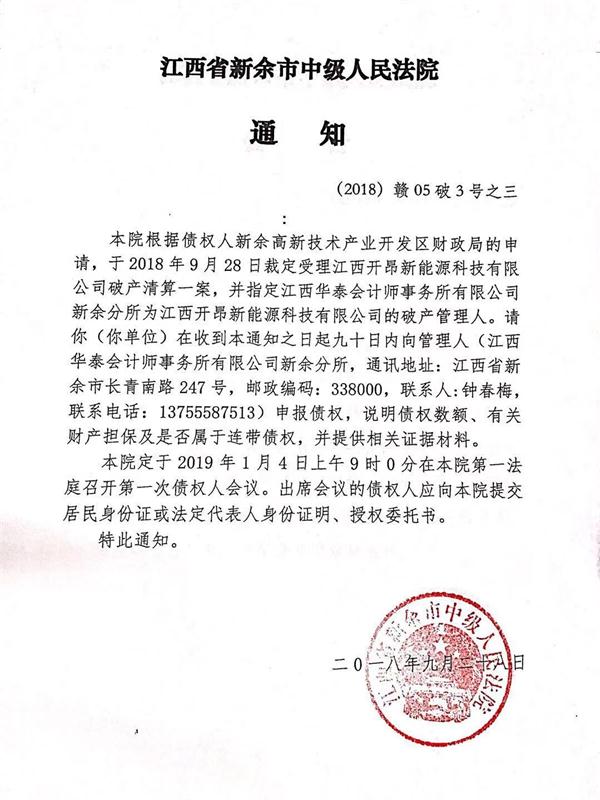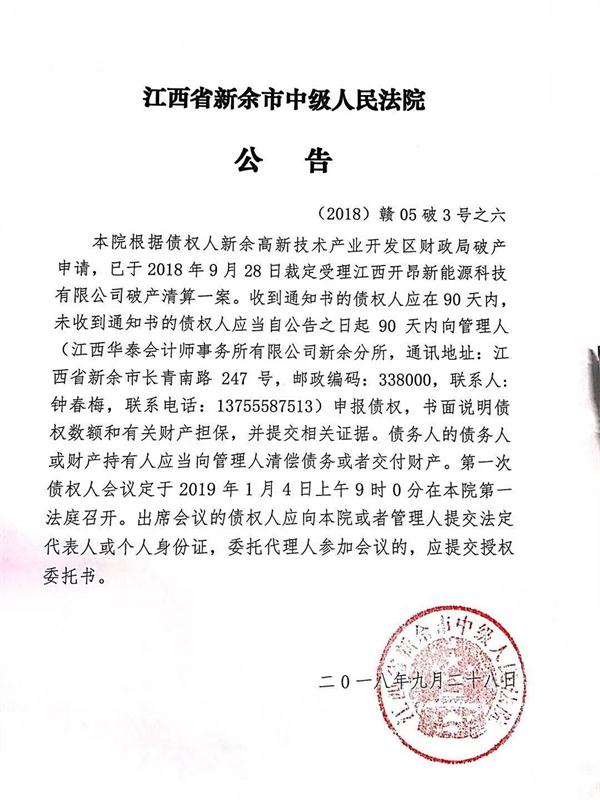 江西开昂新能源科技有限公司破产清算受理法律文书